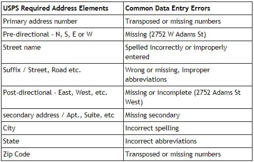 So what makes an address complete? Review the chart below for required elements and common errors: